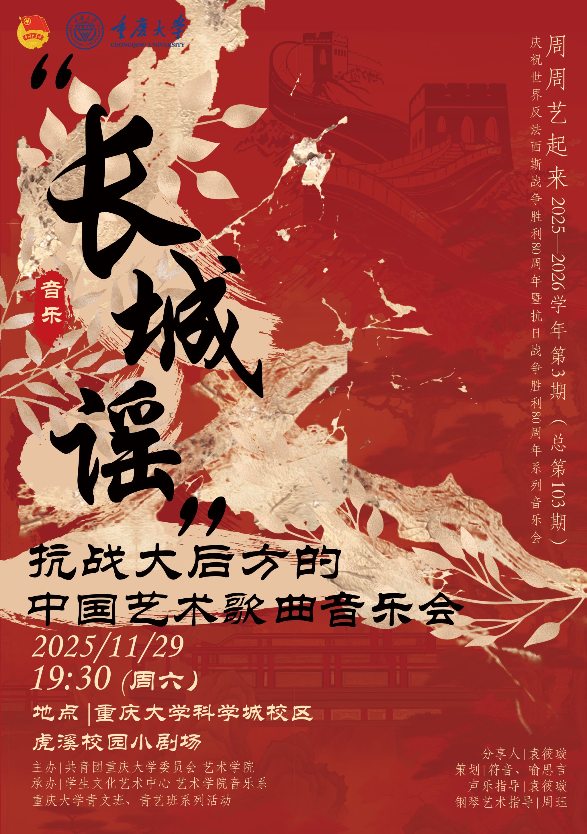 为纪念中国人民抗日战争暨世界反法西斯战争胜利80周年,弘扬伟大抗战精神,厚植师生爱国主义情怀,重庆大学“周周艺起来”2025—2026学年第三期(总第103期)专场“长城谣——抗战大后方的中国艺术歌曲音乐会”,将于2025年11月29日(周六)19:30在重庆大学科学城校区虎溪校园小剧场举行。