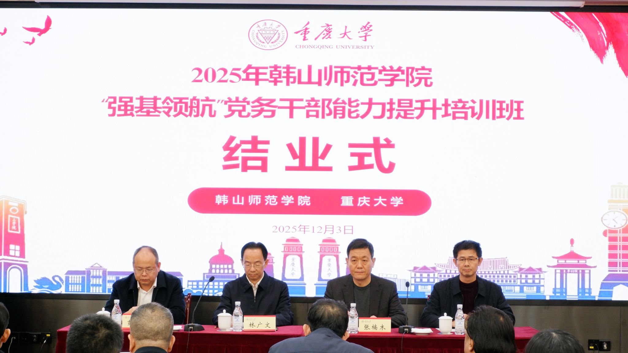院长张楠木首先致辞。他简要介绍重庆作为红岩精神发源地、成渝地区双城经济圈核心城市的区位优势和重庆大学的发展历程,特别指出本次培训班“理论教学+现场感悟+交流研讨”的课程体系设计,正是对“美育+思政”融合理念的生动实践。随后,三位学员代表依次上台汇报培训学习心得体会。学员们纷纷表示,本次培训班主题鲜明、课程内容丰富、形式多元,既夯实了理论根基,又拓宽了实践视野,真正实现了学有所获、获益匪浅。韩山师范学院党委常委、组织部部长郑文锋肯定培训成效,并提醒和布置近期党建重点工作任务。最后,韩山师范学院党委副书记林广文作总结讲话。他首先向授课专家与工作人员表示感谢,向顺利结业的学员表示祝贺,肯定培训在理论、党性提升及党建思路启发上的成效,并提出四点意见:强化理论武装、夯实党建基础、推动党建与业务融合、传承红色基因,勉励学员实干担当,助力学校发展。