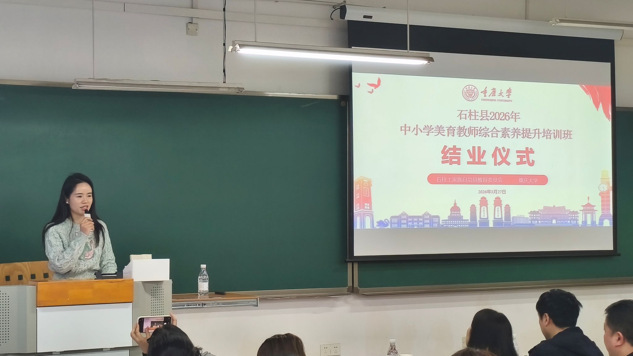 3 月 27 日下午举行培训班结业仪式。肖国安主持并总结培训情况。学员代表石柱县王场镇小学校二级教师马九月汇报学习成果,她表示参加本次培训在理论与理念的引领中,夯实了美育的根基;在实践与创新的前沿,拓展了美育的边界;在探索与融合的启迪中,打开了美育的新视窗。