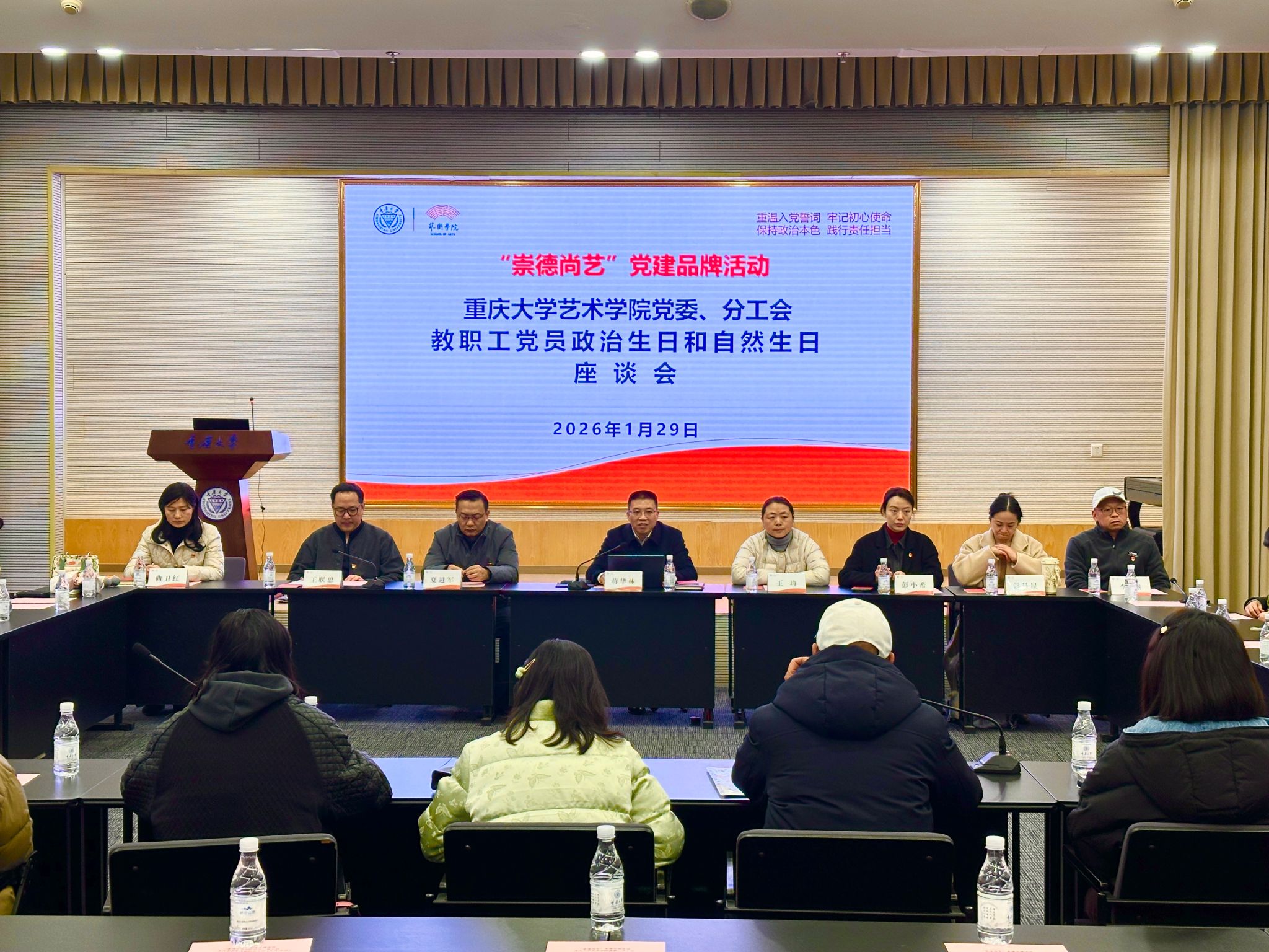 2025年度第2次教职工党员政治生日和自然生日座谈会(简称“双生会”)在虎溪校园图书馆1F-9会议室顺利举行,这是学院党委打造“崇德尚艺”党建品牌的一项重要活动。学院党委书记蒋华林主持会议并讲话,党委副书记、纪委书记王琦,副院长夏进军、彭小希,党委委员曲卫红、彭科星,分工会主席王朕思、副主席李杰等出席。2025年9月至2026年2月期间过政治生日和自然生日教职工40余人参加。