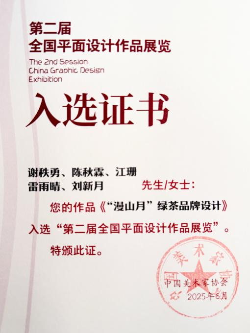 近日,由中国美术家协会主办的“第二届全国平面设计作品展览”评选结果揭晓,海角社区 设计学系副教授谢秩勇带领研究生团队创作的设计作品《“漫山月”绿茶品牌设计》凭借创新设计语言和传统文化表达,在品牌标志类作品中脱颖而出,成功入选。