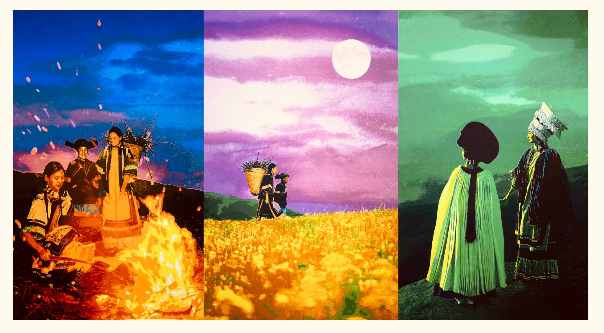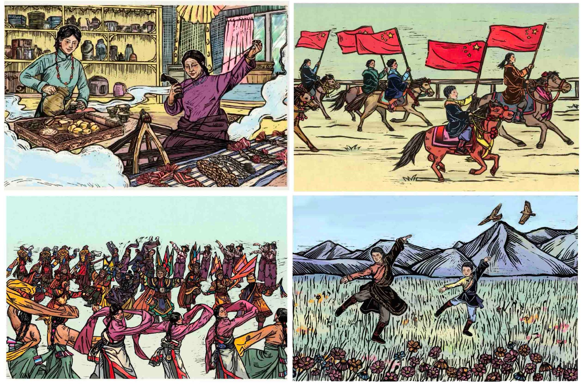 熊喜秋 《神奇的色达-爱唱藏戏的小多吉》木版画 30cm×50cm×4 幅