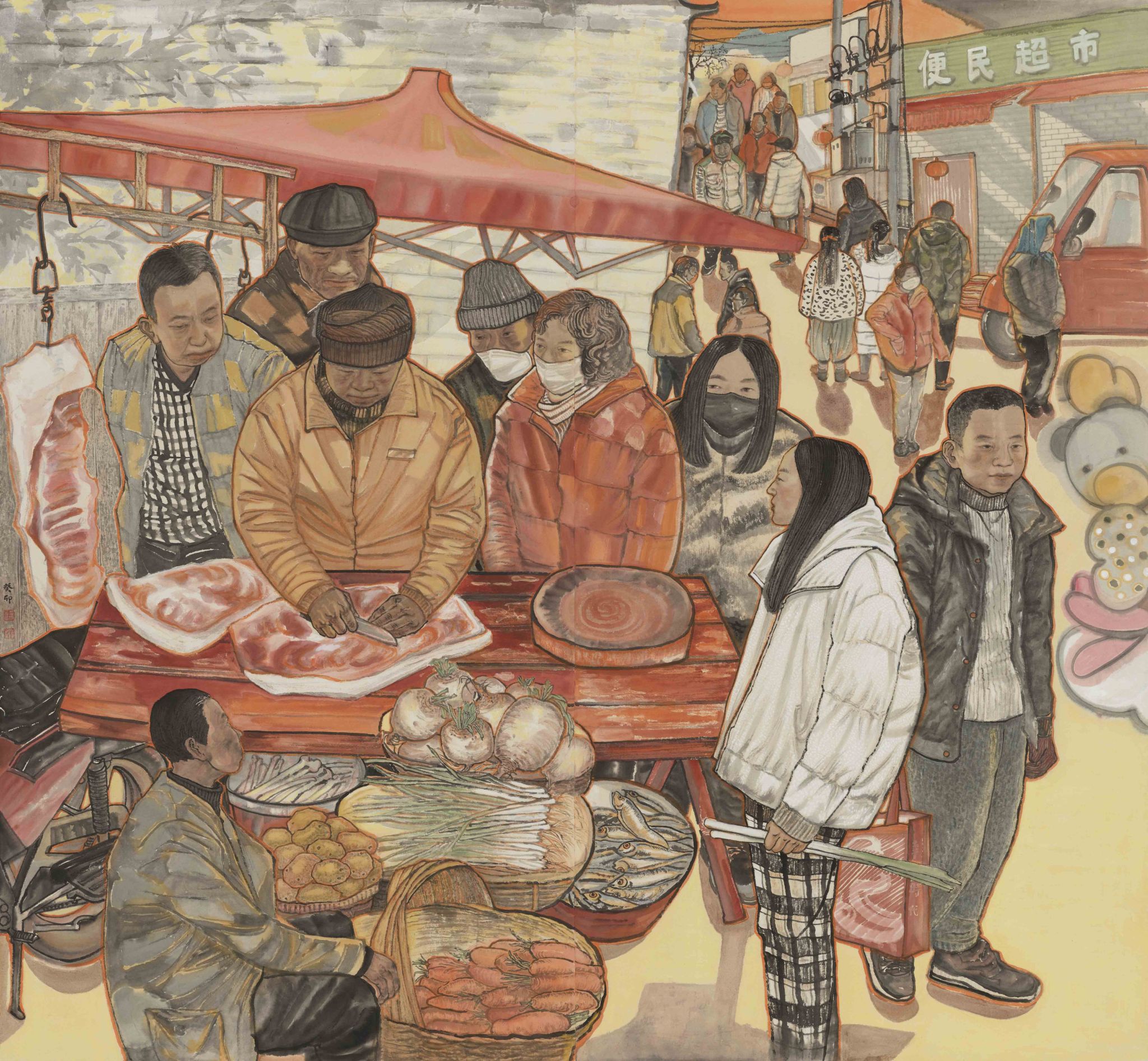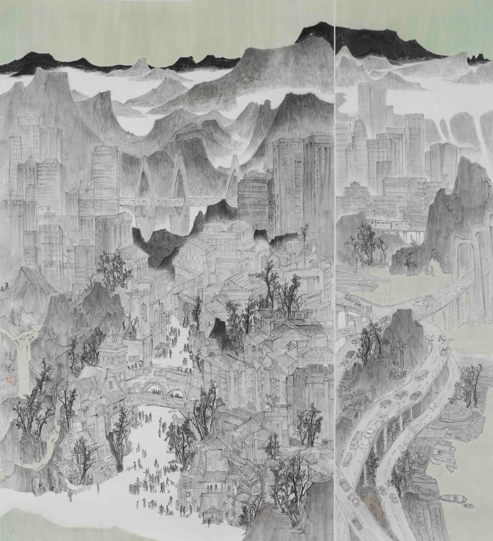 屈婷 《暖冬—新城烟火气》 纸本水墨 194cm×180cm