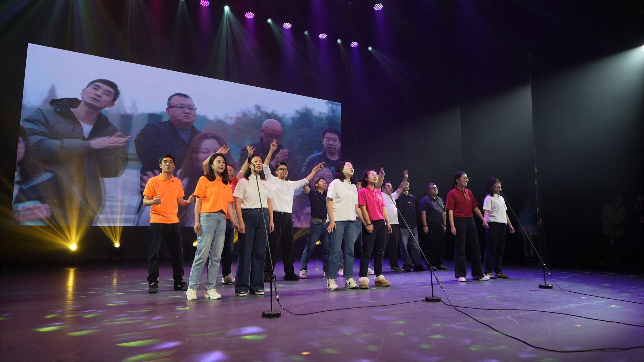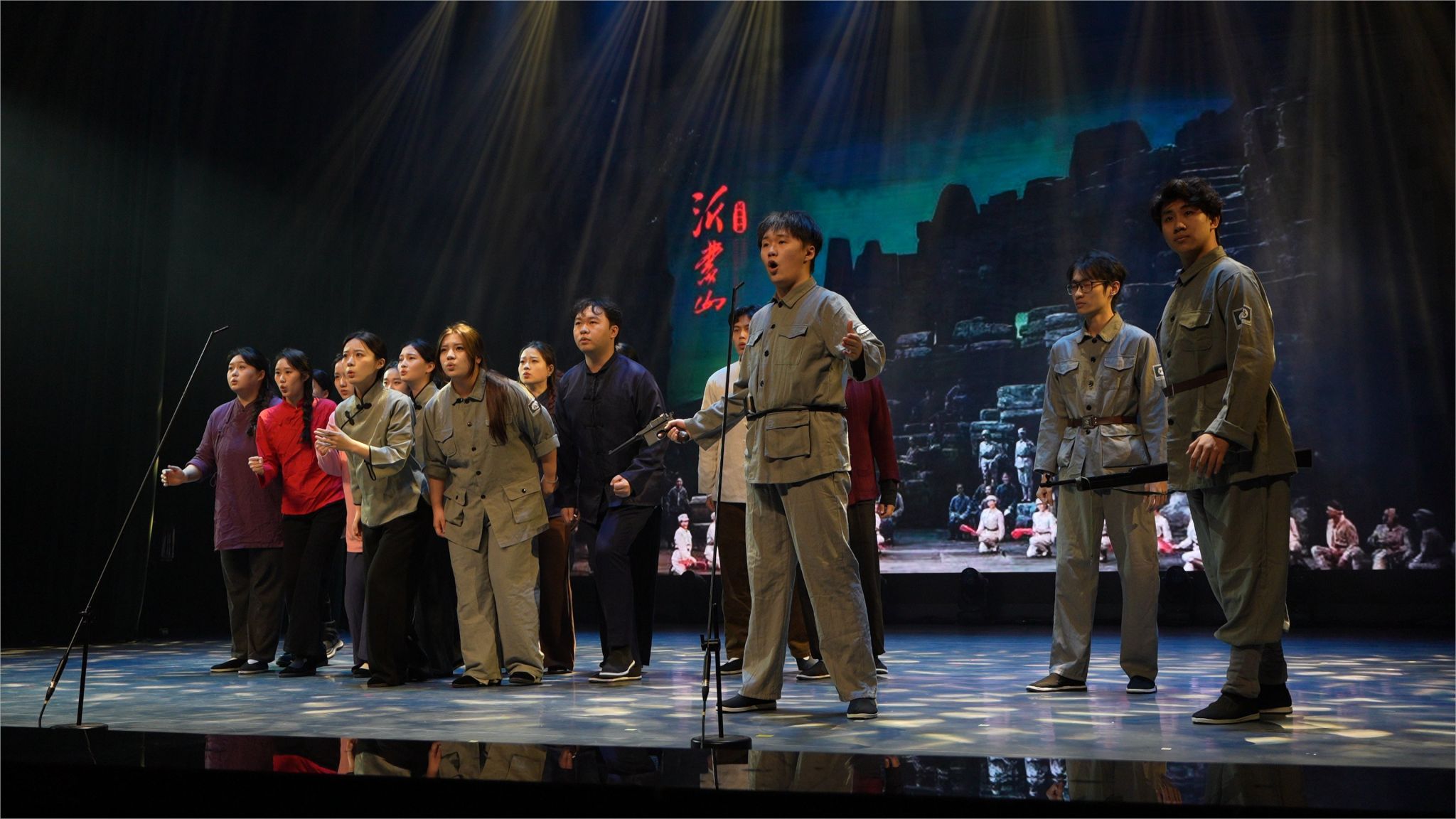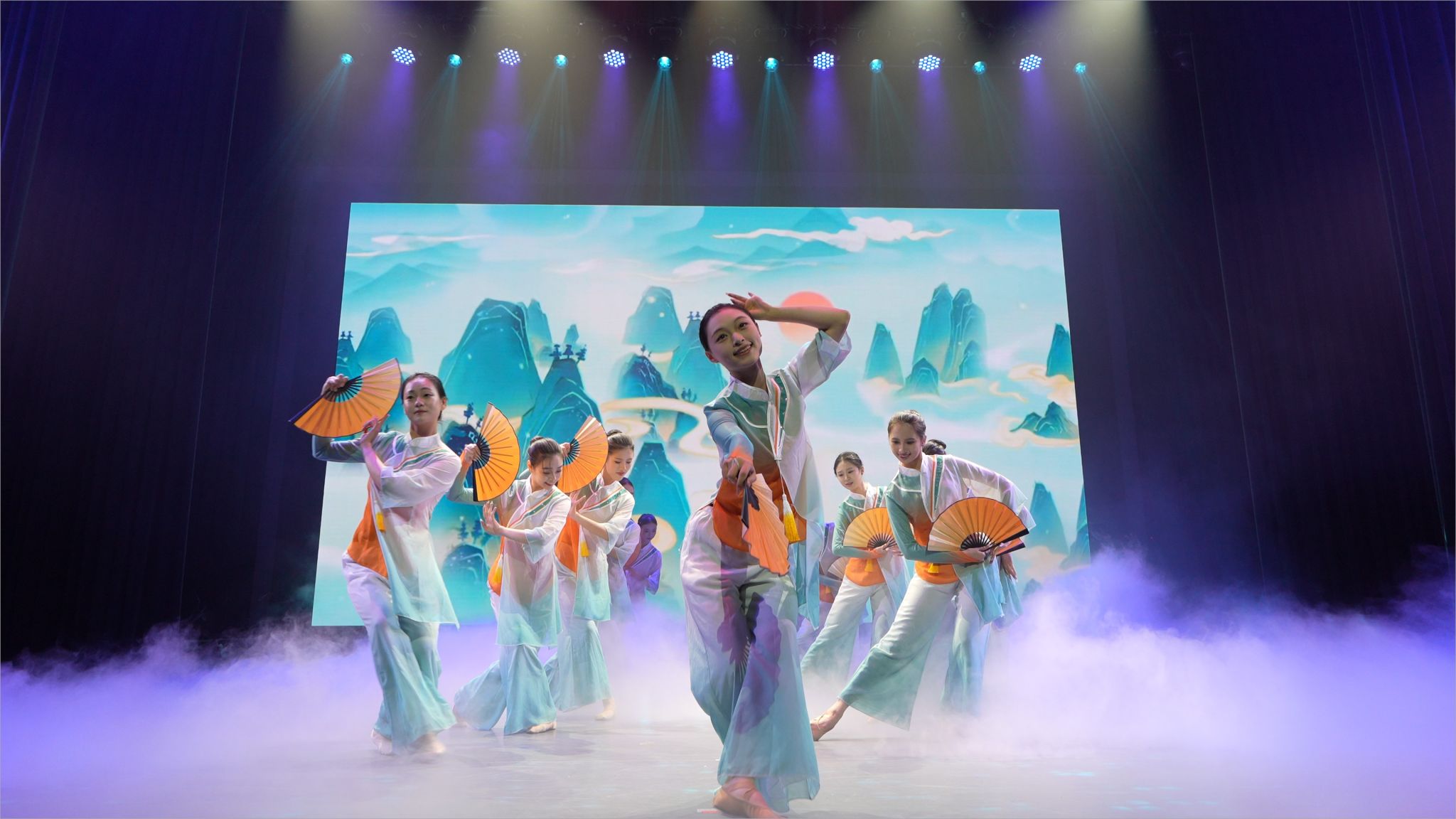 第二篇章《青春激荡 梦想飞扬》中,舞蹈系《醉春风》以扇影柳姿描摹江南春景,一柄折扇开合似风拂水面,裙摆漾起层层涟漪,把“春水碧于天”画进观众眼眸;学院行政管理老师们暖心献唱《相亲相爱一家人》,平日严谨的老师走下办公桌,用略带羞涩却真挚的和声让“家文化”沁润人心;音乐系《童年时光机》以纸飞机与蝉鸣唤醒纯真年代,旧课本、玻璃弹珠、傍晚的稻香统统乘旋律而来;舞蹈系2022级男生《山·行》将巴渝山川搬上舞台,足尖踏出青石板梯,背脊拱成绝壁峰线,写意流动山水,也写少年“会当凌绝顶”的倔强。