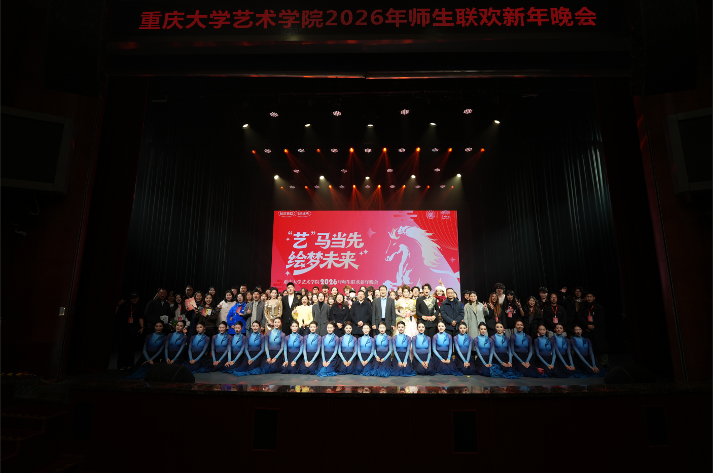在科学城校区虎溪校园小剧场举办“‘艺’马当先、绘梦未来”2026年师生联欢新年晚会。晚会凝结了学院师生的才情与巧思,展现了学院多元斑斓的文化底色与敢为人先的创新气质。学院党委书记蒋华林、院长张楠木,党委副书记、纪委书记王琦,副院长夏进军、彭小希等领导与400余名师生欢聚一堂,在热闹喜庆的热烈氛围中挥别砥砺深耕的2025,跃马奔向崭新的2026。